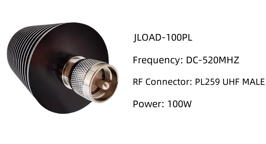 JLOAD-100PL — features a PL-259 (UHF Male) connector, supporting DC–520 MHz.